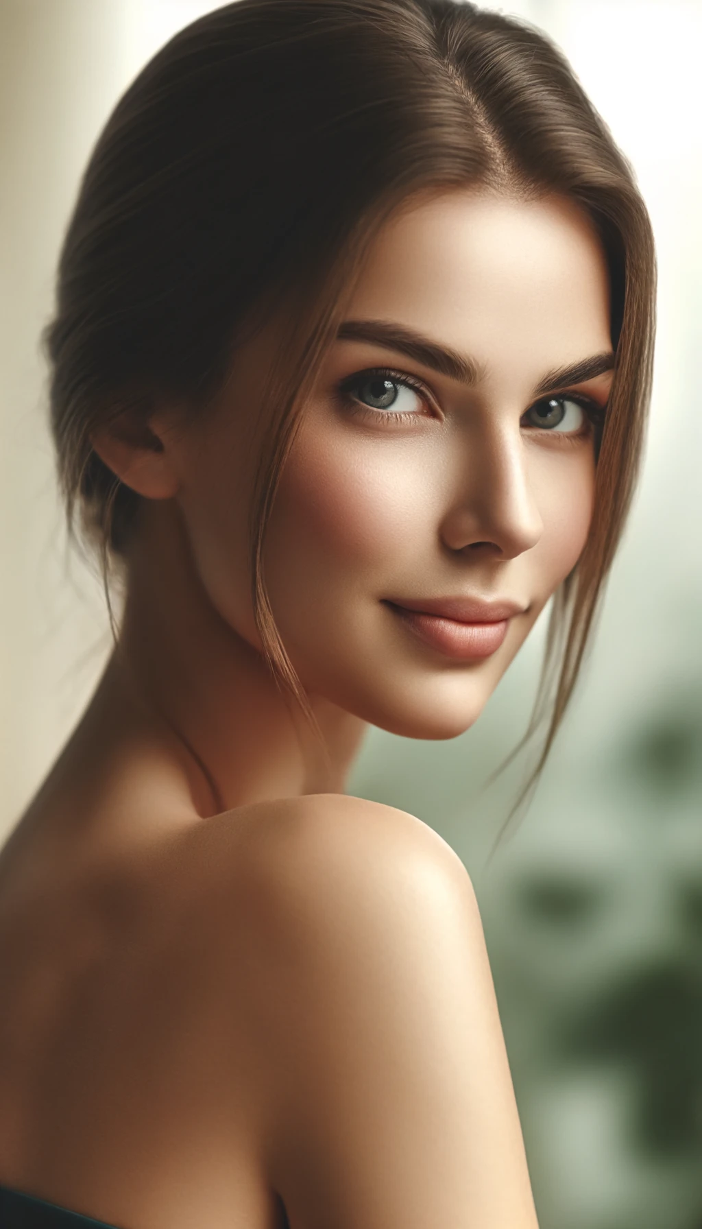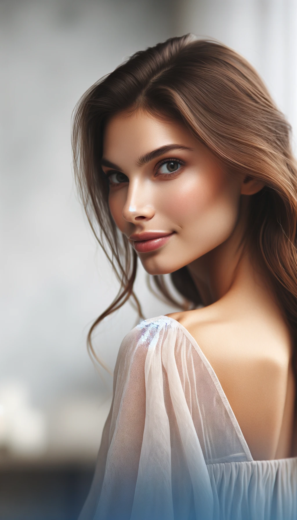 “Create an image of a woman. She is looking over her shoulder, her face visible in profile, slightly turned towards the viewer.”