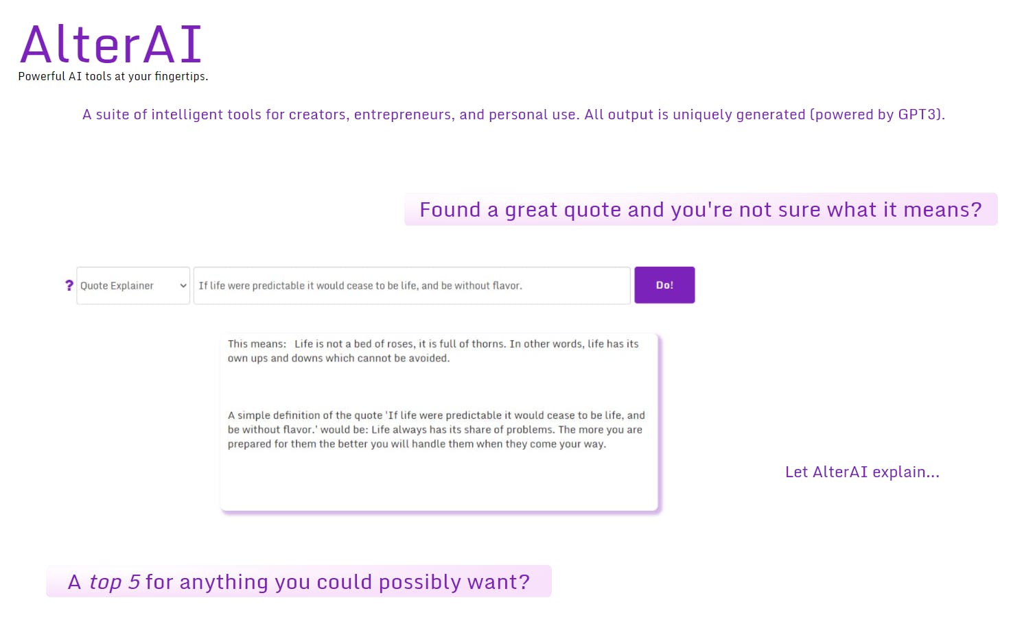I’m pleased to announce AlterAI, a framework of intelligent tools for entrepreneurs, creatives, and personal use. The two features that I am most proud of are the “how-to” and the “top-5”.