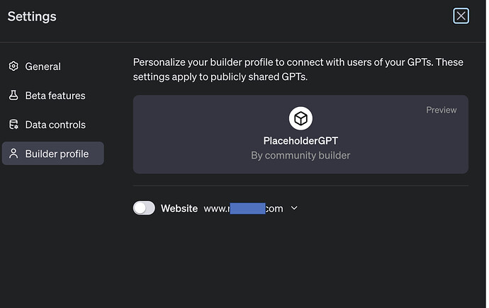 I’ve had my domain verified but i’m still unable to publicly publish the GPT i’ve made (although I can share the link). The builder won’t let me toggle the website button to ‘on’ (despite showing the website). There is also no name option for me (image below).