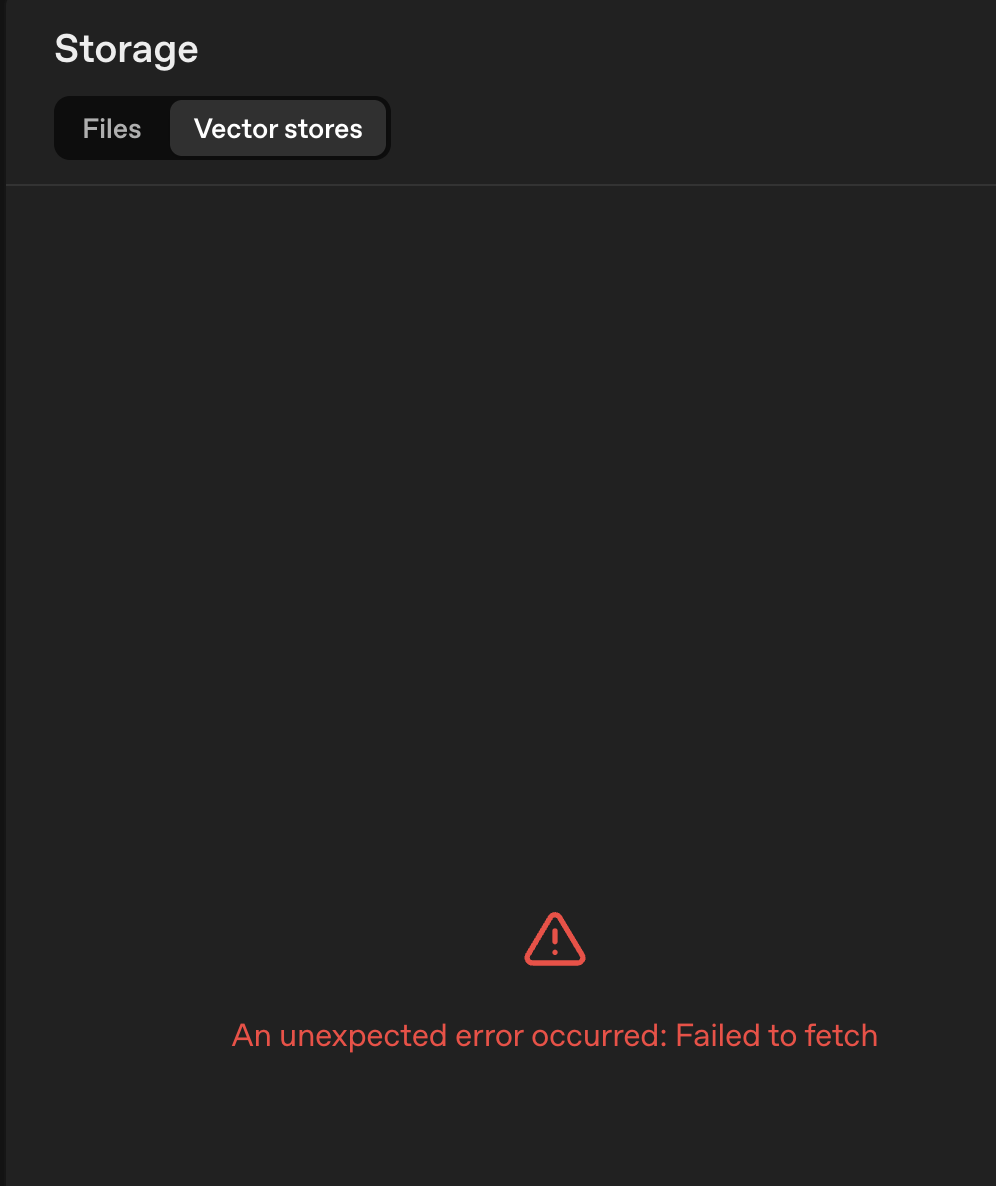 I was able to reproduce the issue using the platform. It’s apparently not possible to retrieve vector stores or to create a new one.