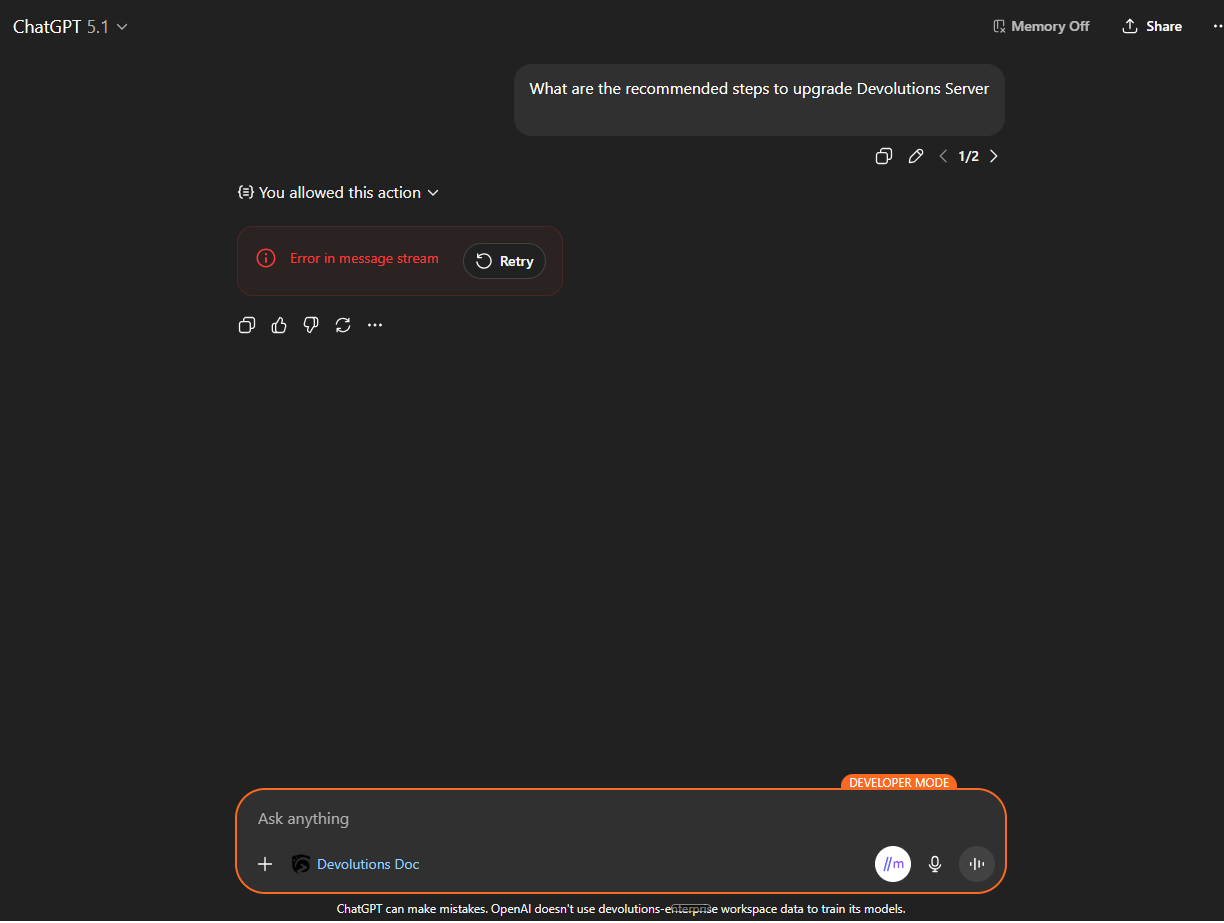 After switching the model from gpt-4.1 to gpt-5.1, the model cannot see the tools provided by the custom mcp server, even though the exact same code works with the gpt-4.1 model. If you ask the model to directly call a tool by name, the model understands what is being referred to, but if you refer to it indirectly using actions, the model cannot determine the tool to call.