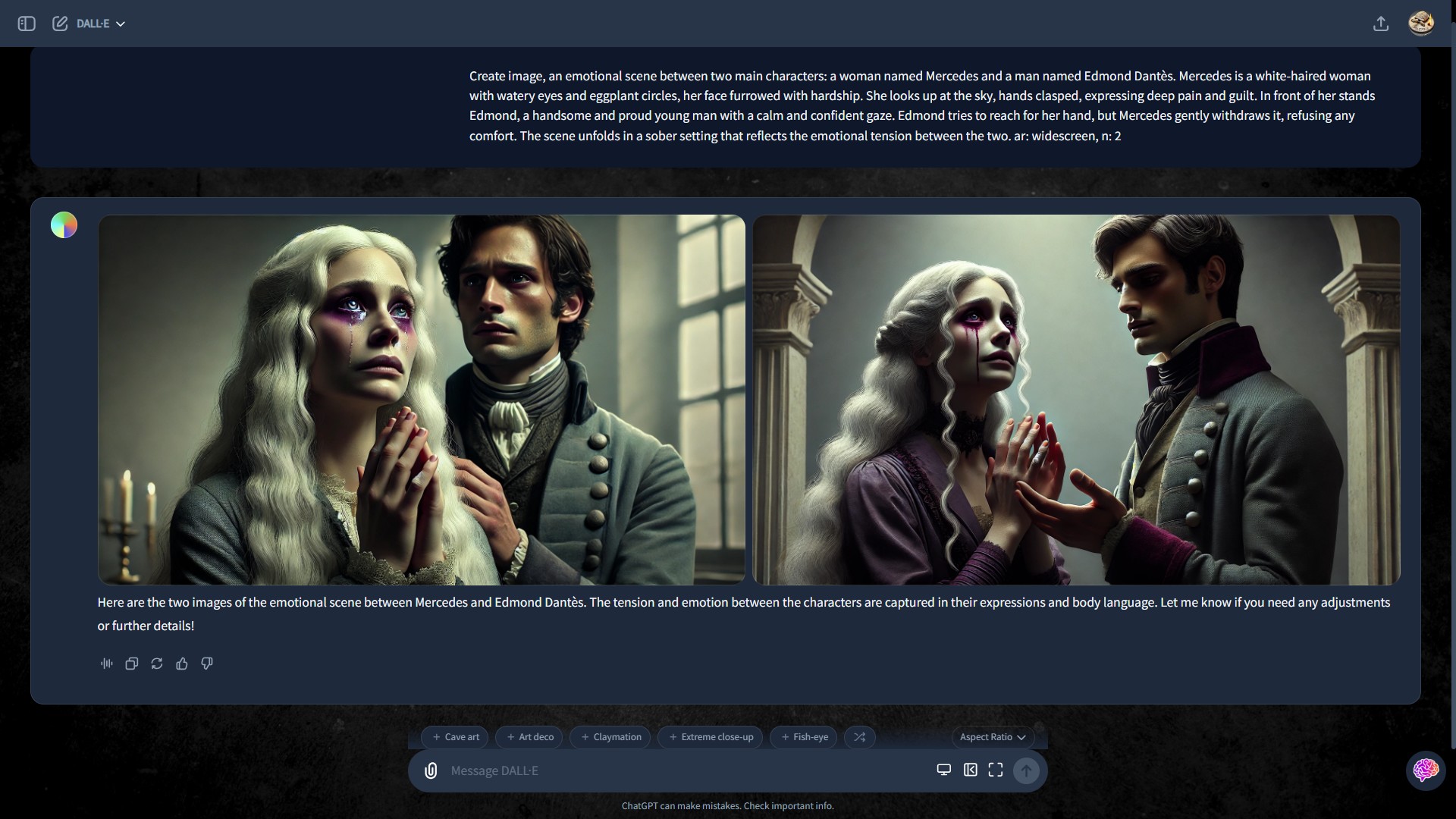Imagine an emotional scene between two main characters: a woman named Mercedes and a man named Edmond Dantès. Mercedes is a white-haired woman with watery eyes and eggplant circles, her face furrowed with suffering. She looks up at the sky, hands clasped, expressing deep pain and guilt. In front of her stands Edmond, a handsome and proud young man with a calm and confident gaze. Edmond tries to reach for her hand, but Mercedes gently withdraws it, refusing any comfort. The scene unfolds in a sober setting that reflects the emotional tension between the two.