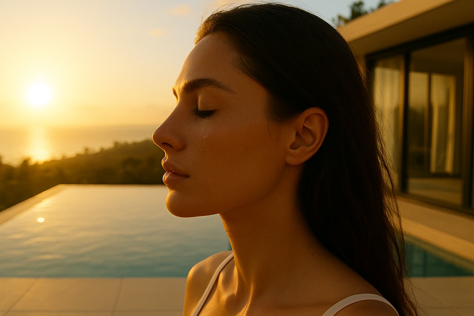 A cinematic close-up profile of a serene Eastern European model poolside at a modern villa during sunrise. The camera is placed on the sun-side of the pool, with the rising sun directly behind the camera, so the visible side of her face is fully illuminated in warm golden light, glowing naturally with no shadows. She has her eyes closed in calm meditation, a single tear reflecting the sunlight as it rolls down her cheek. The villa is softly blurred in the background. Warm, cinematic, art-house aesthetic.
