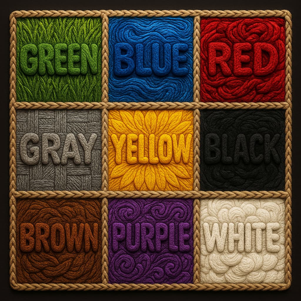 A wide, hyper-realistic artistic rendering of a 3x3 wall-mounted grid of square compartments, each entirely constructed from colorful, tightly woven yarn and embroidery threads. Every compartment displays a color word rendered in thick, sculptural yarn, surrounded by a richly textured fiber background that mimics the essence of the color through surreal textile art. The grid structure is made from braided yarn borders, giving it a handmade, three-dimensional quality.