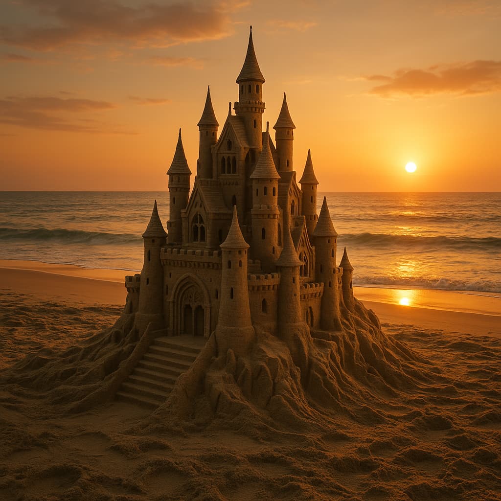 wide cinematic sand castle on the beach at sunset no humans intricate castle design makes you wonder who built it
